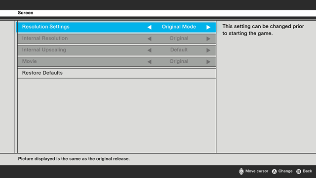 "Original Mode" Preset Display at the game’s original resolution. Upon selecting "Original Mode", the following settings will be applied. Internal Resolution: Original Internal Upscaling: Default Movie: Original