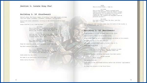 El Screenplay Book es un libro digital que contiene todas las escenas del juego y conversaciones del Códec, así como elementos de la historia en progreso.