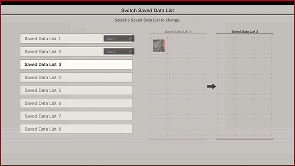 This game comes with eight Saved Data Lists with up to 15 save slots each. Some data, such as photographs, require 2 slots to save.