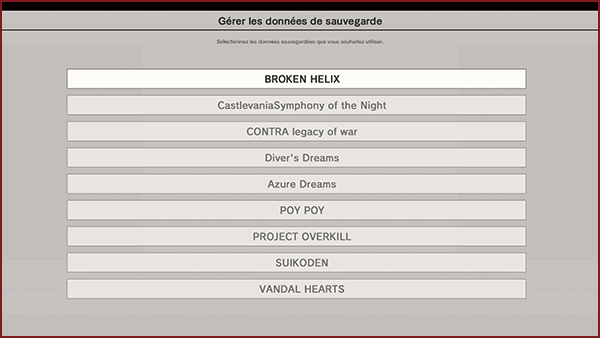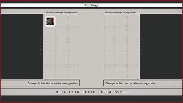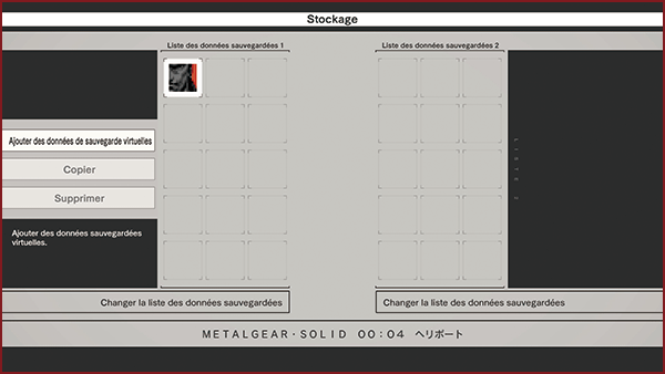 Ce jeu est livré avec 8 listes des données sauvegardées avec jusqu'à 15 emplacements de sauvegarde pour chacune d'entre elles. Certaines données, telles que les photographies, nécessitent 2 emplacements de sauvegarde.
