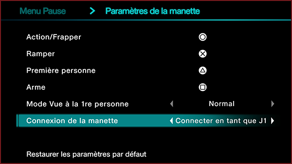 Personnalisez la configuration des touches de la manette (à l'exception des touches non répertoriées), modifiez l'axe de la caméra de la Vue à la 1re personne (normal ou inversé) ou connectez une manette en tant que J1 ou J2. ![]() |