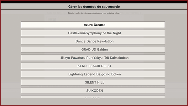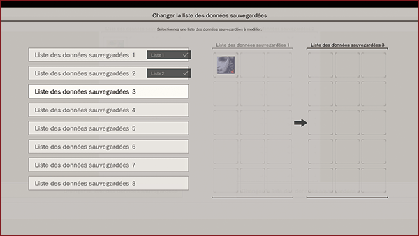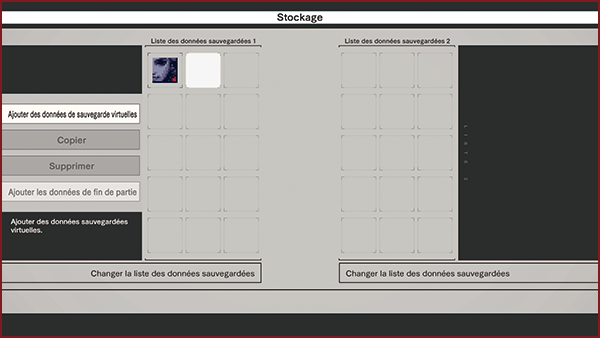 Ce jeu est livré avec 8 listes des données sauvegardées avec jusqu'à 15 emplacements de sauvegarde pour chacune d'entre elles. Certaines données, telles que les photographies, nécessitent 2 emplacements de sauvegarde.