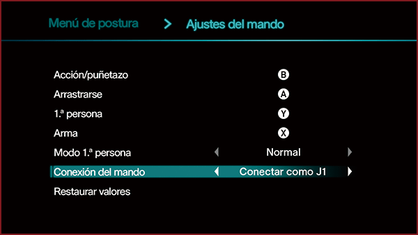 Personaliza los controles del mando (a excepción de los botones que no aparecen en la lista), cambia el eje de la cámara de la vista 1.ª persona entre normal e invertido, o conecta un mando como J1 o J2. ![]() |