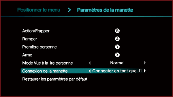 Personnalisez la configuration des touches de la manette (à l'exception des touches non répertoriées), modifiez l'axe de la caméra de la Vue à la 1re personne (normal ou inversé) ou connectez une manette en tant que J1 ou J2. ![]() |