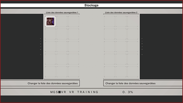 Ce jeu est livré avec 8 listes des données sauvegardées avec jusqu'à 15 emplacements de sauvegarde pour chacune d'entre elles. Certaines données, telles que les photographies, nécessitent 2 emplacements de sauvegarde.