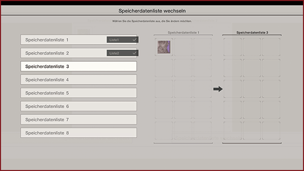 Dieses Spielt bietet acht Speicherdatenlisten mit jeweils bis zu 15 Speicherplätzen. Für einige Datentypen wie Fotos werden 2 Speicherplätze benötigt.