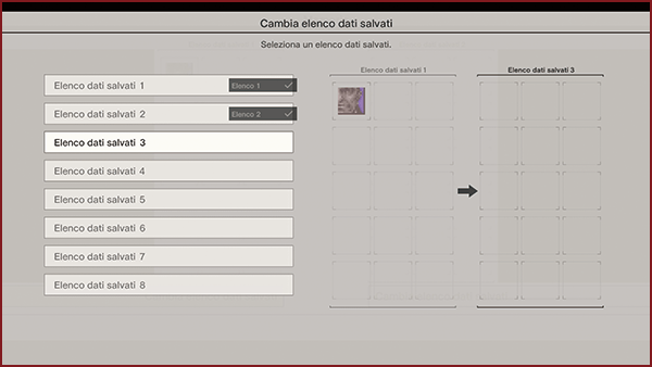 Il gioco dispone di otto elenchi dati salvati da 15 slot ciascuno. Per alcuni dati, come le fotografie, sono necessari due slot liberi.