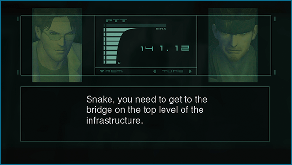 | Otacon / 141.12 | Hear an explanation of the controls, how to proceed through stages, and other game hints. |
