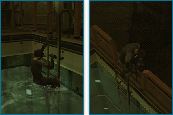 en faisant face à une rambarde, vous pourrez grimper par-dessus et vous suspendre du côté opposé. Utilisez