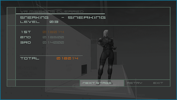Raiden et Snake peuvent être sélectionnés après avoir terminé tous les autres niveaux des VR MISSIONS.