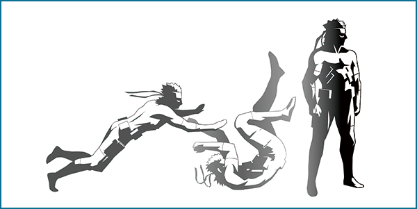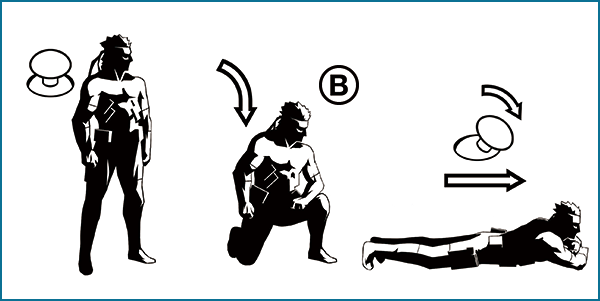 mentre corri per saltare e rotolare in avanti (Snake) o per rotolare (Raiden). Questa azione permette di muoversi velocemente da una posizione all'altra e saltare trappole e piccoli ostacoli. Lanciarti contro un nemico gli farà perdere l'equilibrio. Rotolare può anche aiutarti a spegnere le fiamme dopo aver preso fuoco.