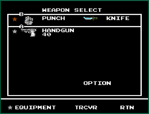 | Arma (B) | Elige si prefieres luchar sin armas ("PUÑETAZO") o usar un cuchillo ("CUCHILLO"). |
